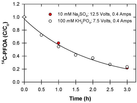 Supporting electrolytes are used to provide an electro-conductive medium and minimize the voltage drop and resistance of the electrochemical reactor [15,26]. High electrical conductivity leads to faster electron transport and a better degradation rate for organic pollutants. Zhuo et al. [28] found that the electrochemical oxidation of 6:2 FTS decreased in the trend of NaClO4 > NaCl > Na2SO4. To avoid the potential for organochloride byproducts, chlorate, or perchlorate from forming, we compared Na2SO4 versus KH2PO4 and found no differences in rate constants (Figure 4). It is important to note that by increasing the salt concentration, lower voltages produced similar amperage. Thus, if amperage or current density was similar (8 mA cm−2, Figure 4), kinetic rates were similar.