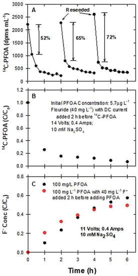 Following the generalized procedures, 14C-PFOA was reseeded into the stirred batch reactor and treated with two BDD electrodes at pH 2.5. Reseeding occurred at 2 h and 4 h after the initial (T = 0 h) experiment was started. Temporal samples were taken every 15 min, mixed with the cocktail, and analyzed by LSC.