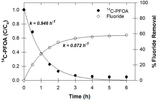 By using 14C-labeled PFOA and measuring temporal loss of 14C-activity and fluoride generation, we were able to quantify the transformation rate of the parent structure (i.e., 14C-PFOA) as well as the transformation of the subsequently formed shorter chain degradation products (Figure 6). Results showed nearly complete transformation of the PFOA molecule with approximately 60% defluorination (Figure 6). Both PFOA removal and F- generation plateaued after approximately 3 h with defluorination occurring at a slightly lower rate than PFOA degradation (Figure 6).
