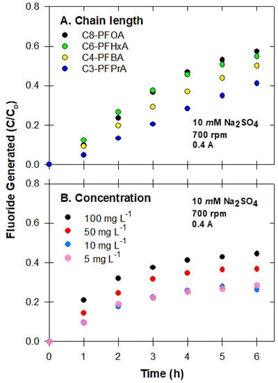 Results showed that fluoride generated from the perfluorinated compounds were generally linear during the first 3 to 5 h (Figure 7A) with the longer chain length compounds producing a higher percentage of defluorination. Although defluorination rates were slightly slower for the shorter chain compounds, our results confirm that these compounds were not resistant to EC-BDD oxidation. Radjenovic et al. [16] reported that longer chain PFAS are more hydrophobic and have a higher affinity to adsorb to electrode surfaces than shorter chain PFAS, and that this would enhance electrooxidation and defluorination. Barisci and Suri [35] specifically treated short and long chain pefluorocarboxylic acids with Si/BDD electrodes and found overall defluorination was greater with longer carbon chain lengths. Short chain PFAS are characterized as having lower molecular polarizabilities [36], which is the ability of a compound to form a dipole in an electrical field, and is the one molecular descriptor that corresponds with observed reaction rates of PFAS treated by electrochemical oxidation [16,36].