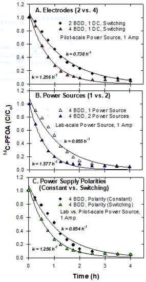 Laboratory results using 14C-PFOA and the 3D reactor with different power sources (pilot-scale vs. laboratory-scale) showed that reaction rates could be influenced by adjusting the number of electrodes, power sources and polarity (Figure 9). By using 4 BDD electrodes over 2 BDD, reaction rates increased from k = 0.738 h−1 to 1.256 h−1 (Figure 9). Similarly, using two power sources was superior to a single power source (k = 0.855 vs. 1.577 h−1) and by switching the polarity of the electrodes every 30 s, degradation rates were greater than rates obtained using a constant polarity (k = 0.854 vs. 1.256 h−1) (Figure 9).