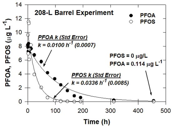 Temporal changes in PFOA and PFOS concentrations in 208 L barrel pilot-scale experiment.