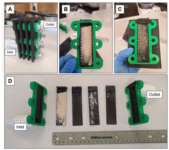 Photographs of pilot-scale BDD reactor after treatment: (A) before disassembly. (B) first BDD electrode (front side facing incoming solution) and (C) back side of first electrode. (D) Front side of all 4 BDD electrodes.