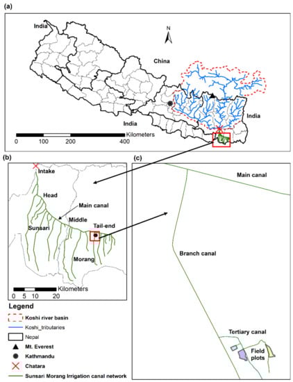 (a) The Sunsari Morang Irrigation Scheme. (b) Sunsari Morang irrigation canal network. (c) The locations of experimental field plots used in this study. Green lines represent the Sunsari Morang irrigation canal network, the blue lines represent tributaries of the Koshi River, and the red dotted line represents the boundary of the Koshi River basin down to the irrigation headwork, marked by a red X.