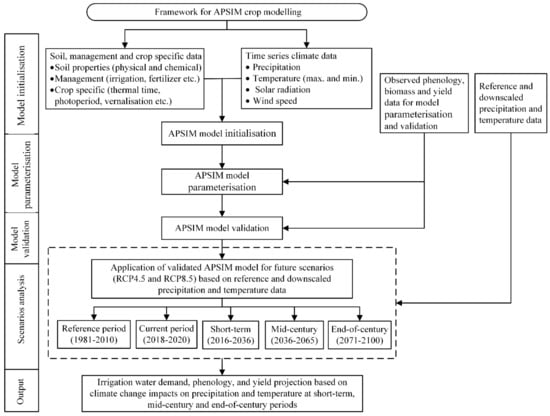 APSIM is an international farming system model that allows customisable sub-models (biophysical, management, data input and output etc.) []. APSIM combines biophysical modules to simulate cropping systems at a daily time step, accounting for climate, surface and soil organic matter, management options, soil water, soil organic matter, and other biophysical and biochemical soil properties. Past work has shown that APSIM reliably simulates manifold cropping systems, including paddy rice, wheat, chickpea, canola, cotton, maize, millet, mung bean, sorghum, and sunflower [,,,,]. The APSIM-Wheat model [] has been successfully calibrated and validated in many parts of the world, including Australia [,,,,,,,,], China [,,,,,], Ethiopia [], Iran [], and India []. APSIM-Wheat v7.10-r4158 was used to conduct all simulations in this study.