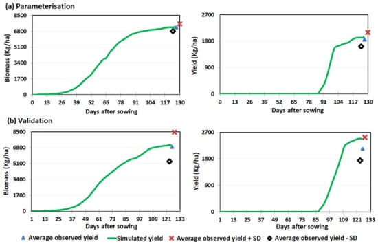 The biomass and grain yield for the parameterisation and validation were obtained from the in-situ field level experiments. The observed and simulated biomass and grain yield for the parameterisation and validation are shown in Figure 4. In all cases, the simulated biomass and yield were within one standard deviation of the observed mean, indicating appropriateness of the parameterisation.