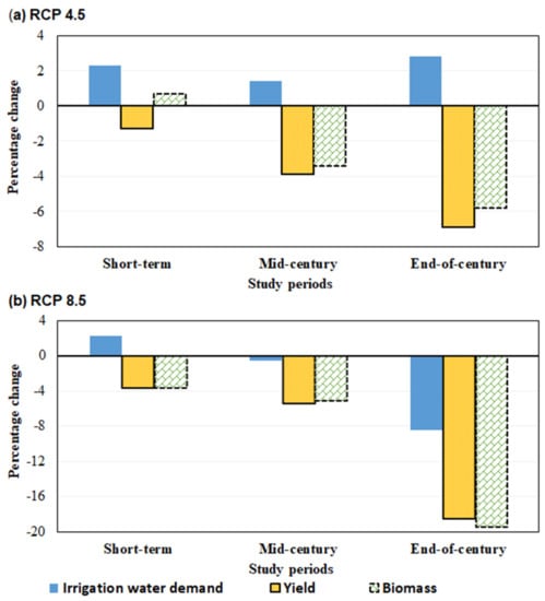 For the historical period of 1981–2010, 429 mm of irrigation water was required to reach a potential yield of 5800 kg/ha and biomass of 18,025 kg/ha (Figure 5). The projected mean irrigation water demand increased by 2%, 1%, and 3% in the short term, mid-century and end of century for RCP4.5. For RCP8.5, respectively, and the mean irrigation water demand increased by 2% in the short-term period but decreased by 1% and 8% for the mid-century and end of the century, respectively.