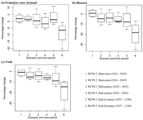 Variability in projected irrigation water demand, biomass, and yield compared with the reference period of 1981–2010. Boxplots show minimum, 25th percentile, median, 75th percentile, and the maximum.