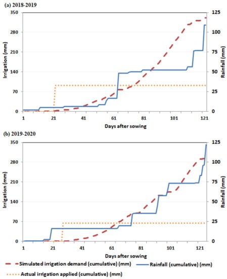 Similarly, farmers near the monitored field plots did not irrigate for a second time in the 2019–2020 crop period, considering a total of 38 mm of rainfall (16 mm during floral initiation and 22 mm during flowering) to be sufficient to maintain crop growth (Figure 7b). However, 38 mm of rainfall is much less than the 222 mm of irrigation required between floral initiation and maturity. Given the actual grain yields in both 2018–2019 and 2019–2020 were less than half of the potential grain yield, such under-irrigation has clearly contributed to a significant reduction in grain yields.