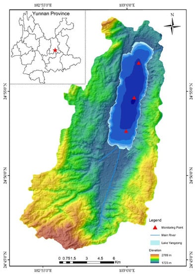 Lake Yangzong is a freshwater lake located in Yiliang county, Yunnan Province (24°51′–24°58′ N, 102°55′–103°02′ E). Its average water depth is 20 m with a maximum depth of 31 m. The lake has an average altitude of about 1800 m above sea level, with a lake area of 31 km2 and a water volume of 6.04 × 108 m3. The catchment of Lake Yangzong belongs to the northern subtropical monsoon climate zone, covering an area of 192 km2. The annual average temperature of Lake Yangzong is 15.2 °C, the average maximum temperature is 21.5 °C, and the average minimum temperature is 12.4 °C [], with an obvious difference in wet and dry seasons and strong evaporation in dry seasons []. The main rivers flowing into the lake include the Yangzong River, Qixing River and Luxichong River in Chengjiang County, Baiyi River, and Tangchi River in Yiliang county []. The annual average surface rainfall of Lake Yangzong is 824.7 mm. The rainy season is from May to October, during which precipitation accounts for 85% of the total annual rainfall, forming a typical low-latitude regional climate. The main water source of the lake is atmospheric precipitation. Rainfall is sufficient in summer and scarce in winter, forming two transition periods in spring and autumn [].