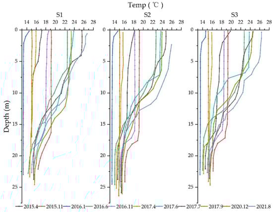 The difference among the three monitoring sites was not significant horizontally. In April 2015, the water temperature in the northern part of the lake was higher than the others. In July 2017, the water temperature in the southern part of the lake was higher than the others. In November 2015, according to the strict definition of thermocline [], the thermocline in the south part of the lake disappeared, and the mixing period started.