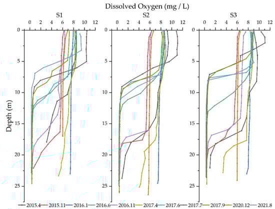 DO is the molecular oxygen dissolved in the water from the air. It is influenced by temperature, algae growth, biochemical reaction, etc. During the thermal stratification period, algal photosynthetic and atmosphere reaeration efficiency in epilimnion was high. With increasing water depth, photosynthesis weakened. Respiration of the upper aquatic organisms consumed the oxygen produced by photosynthesis, causing a lack of oxygen in the deeper waters. In addition, DO deletion in the hypolimnion is due to geochemical DO consumption during decomposition and stable stratification prevent mixing. Therefore, in this period, DO decreased from the surface to the bottom, especially in summer, DO in the middle layer of the lake decreased sharply and tended to be ~0 (0.34 mg/L) at the bottom layer. According to a study by Kalff Jacob et al. [], the solubility of DO in freshwater mainly depended on the water temperature. Under constant air pressure, a lower water temperature led to a higher concentration of DO. Therefore, compared with December 2020 and January 2016, the winter season, January had a higher DO (7.925 m/L) at lower temperatures (Figure 2 and Figure 3).