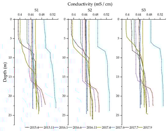 Similar to the temperature, DO and pH classification, the changes in conductivity could also be divided into four seasons. In April 2015, January 2016 and April 2017, except for the difference in value, the vertical and horizontal conductivity variation was insignificant. In spring, conductivity slightly increased with depth in the vertical direction, but with a very small amount. The changes at the three monitoring sites were similar. The conductivity in April 2017 (0.458 mS/cm) was higher than in April 2015 (0.447 mS/cm) and had no stratification. In summer, the stable stratification of conductivity began to form. At this stage, there was a sharp increase in the middle part of the vertical profile. In June 2017, the conductivity showed an abnormally high value (up to 0.532 mS/cm). The horizontal distribution difference was small in the same month. Except in July 2017, the surface conductivity of the northern part was higher than the southern and central parts. Among them, the highest conductivity was recorded in June 2017. In autumn, the conductivity was higher than that of summer. Vertically, the conductivity increased sharply within the range of 16 m to 20 m. Horizontally, there was no significant difference among the three monitoring sites.