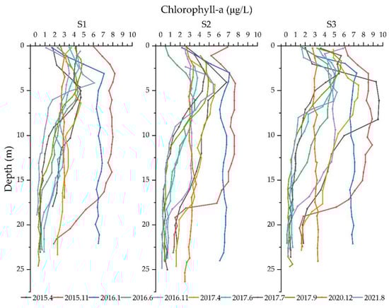 Significant changes could be found in different seasons. There were obvious differences in both Chl-a value and variation trends in winter and early spring. In spring, the difference in the vertical and horizontal directions was obvious. The concentration of Chl-a was significantly high in the northern part of the lake in April 2015, and there was a clear peak within the 4 m to 8 m water depth. In the central and northern parts of the lake, there were lower values between the 4 m and 6 m water depths, respectively. In April 2017, the concentration of Chl-a first increased and then decreased with an increase in depth. The concentration in the central and northern parts increased sharply within 4 m of the epilimnion, while in the southern part of the lake, the Chl-a concentration increased less within 6 m of the epilimnion and did not change much in other depth ranges. The Chl-a concentration in April 2015 was higher than that of April 2017. In spring, the changes in the lake were disordered, and the concentration of Chl-a was higher in the northern part of the lake. In summer, a stable peak formed in the vertical profile. In July 2017, a peak was recorded from 0 m to 5 m at a value of ~5 μg/L. In June 2016 and 2017, the peak and depth decreased more than in July 2017. The stable stratification structure formed at all monitoring sites and all months during this stage, except for the variation in June 2017 in the southern part. In autumn, the Chl-a concentration in November 2015 was extremely high and clustered in the range of 2 m to 18 m water depth. The stratification in this stage was obvious, and the variation trend of all monitoring sites was consistent. In winter, the concentration was higher than in early spring. In January 2016, the concentration of Chl-a increased within the top 4 m and remained similarly constant at ~6 μg/L below 4 m. In December 2020, Chl-a demonstrated little change at each depth.