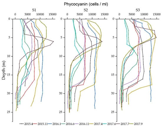 In winter and early spring, the phycocyanin concentration was at its highest level and was largely distributed at water depths of 4 m to 17 m. In January 2016, the phycocyanin concentration first increased, then stabilized. In April 2015, the phycocyanin concentration gradually increased from south to north, with little change in the horizontal direction in the remaining months. The concentration in April 2017 was higher than in April 2015. In summer, stratification stably developed, and compared to spring, the range was narrower. In June 2016 and June 2017, the phycocyanin concentration peaked between a water depth of 10 m to 12 m in the central and northern part of the lake, and stratification was obvious. In July 2017, the phycocyanin concentration increased sharply at water depths ranging from 3 m to 8 m and reached a peak at about 6 m water depth and then suddenly decreased. In September 2017, the phycocyanin concentration decreased sharply after reaching a peak at 5 m to 7 m water depth and was highest at water depths ranging from 0 m to 3 m compared to the other months. In autumn, the concentration increased and remained at a middle level. The stratification maintained a similar trend at different monitoring sites. In November 2015 and 2016, the phycocyanin concentration in the entire lake was relatively high and stable at water depths ranging from 4 m to 16 m water depth, with small vertical changes.