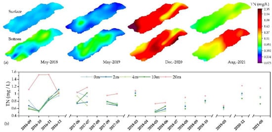 Change in TN content in Lake Yangzong from 2017 to 2021. (a) indicates the distribution of TN content in the whole lake at the surface and bottom. (b) represents the mean value of TN content at 5 different depths.