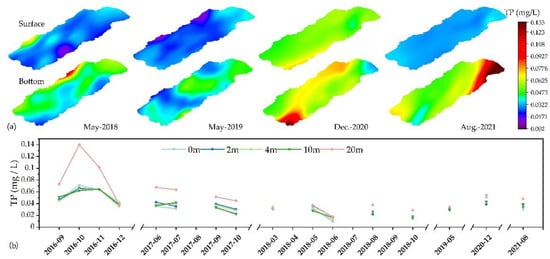 Changes in TP content in Lake Yangzong from 2017 to 2021. (a) indicates the distribution of TP content in the whole lake at the surface and bottom. (b) represents the mean value of TP content at 5 different depths.