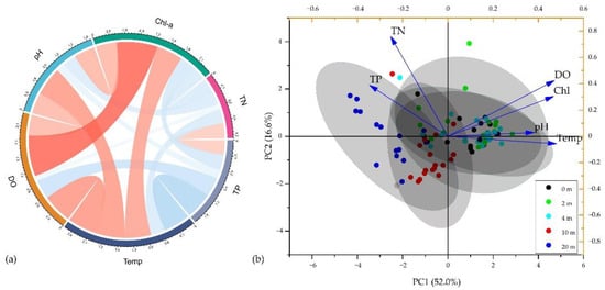 Correlation (a) and principal component (b) analysis of various water quality parameters.