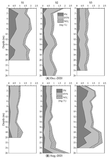 The content of particulate nitrogen (PN) and dissolved total nitrogen (DTN) at S1 was significantly higher in December 2020 than in August 2021, and the opposite was found at S3. In December 2020, the nitrate nitrogen (NO3−) content changed very little with water depth, and in August 2021, the NO3− content gradually increased with depth.