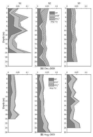 At S1, in December 2020, the particulate phosphorus (PP) content was significantly higher than in August 2021 and fluctuated greatly with water depth. There was little difference between the two seasons in dissolved total phosphorus (DTP). The content of PP at S3 in August 2021 also fluctuated with water depth. The orthophosphate (PO43−) content of the whole lake in December 2020 was significantly higher than in August 2021.