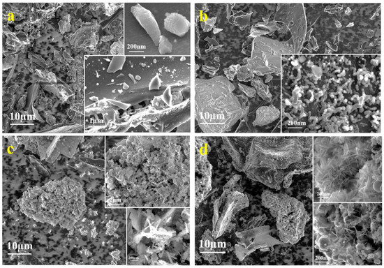 SEM imagines of biochar materials (a) BC, (b) B6@BC, (c) nZVI@BC, and (d) nZVI/B6@BC.