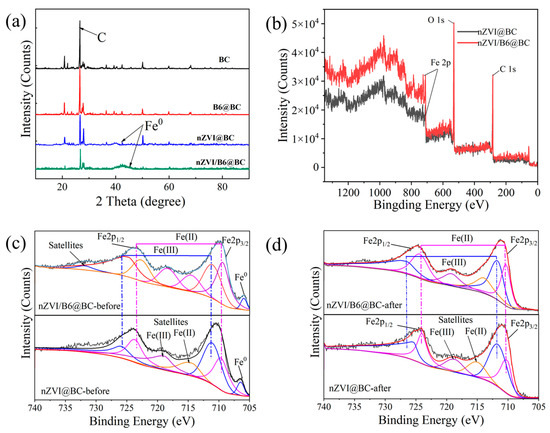 X-ray analyses of biochar materials (a) XRD, (b) XPS, (c) high-resolution Fe spectra of nZVI@BC and nZVI/B6@BC before OTC removal application, and (d) high-resolution Fe spectra of nZVI@BC and nZVI/B6@BC after OTC removal application.