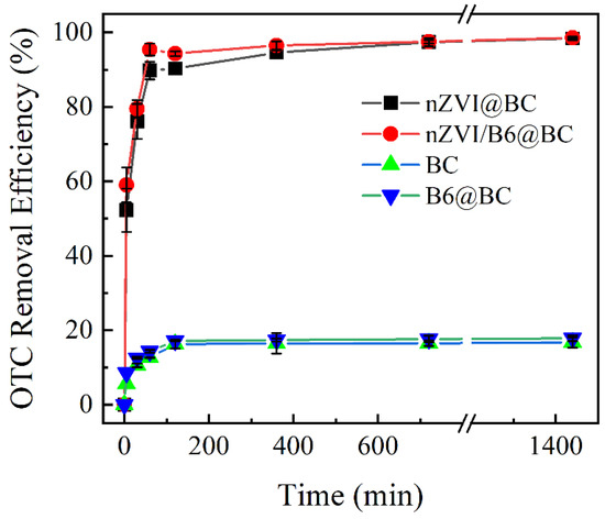 The removal efficiencies were displayed as the Figure 5 shown in the following order: nZVI/B6@BC > nZVI@BC > B6@BC > BC. The 24-h OTC removal efficiencies in BC and B6@BC suspensions only approached 16.51% and 17.49%, respectively, and no significant change was observed between 2 h and 24 h. It is assumed that there is only adsorption on BC and B6@BC, and the adsorption equilibrium was reached after 2 h. Without the iron modification, the adsorption capacity of B6@BC compared to BC was slightly increased from 81.38 mg/g to 85.64 mg/g only via B6-coating. Meanwhile, the 24-h efficiencies in nZVI/BC and nZVI/B6@BC suspensions approached 98.40% and 98.55%, illustrating that OTC had been almost completely removed. Moreover, the 5-min OTC removal efficiencies in nZVI@BC and nZVI/B6@BC suspensions were 52.25% and 59.05%, respectively. Such dramatically rapid removal rates indicate the great removal performance, which may be due to the strong oxidation of ·OH radicals generated through the Fenton reaction triggered by iron on biochar. Moreover, 98.28% of OTC was removed within 60 min in the nZVI/B6@BC suspension. It may be attributed to the amino and hydroxyl groups of B6 as a mediate between BC and nZVI, improving the stability of nZVI attachment and generating more active sites on nZVI/B6@BC for OTC removal than nZVI@BC. Furthermore, the reusable performance of nZVI@BC and nZVI/B6@BC were also exanimated through 4-time cycles of OTC removal (Figure S1). Although the removal efficiencies of these two materials declined after multiple cycles, nZVI/B6@BC exhibited a significantly higher removal capacity than nZVI@BC due to the B6-associated stabilization of nZVI.