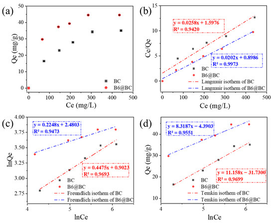The equilibrium of (a) original adsorption capacity and adsorption isotherm modelling (b) Langmuir isotherm, (c) Freundlich isotherm, and (d) Temkin isotherm of OTC on BC and B6@BC.