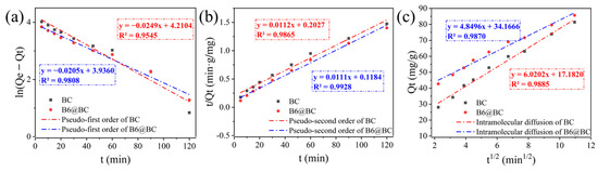 Adsorption kinetic modelling including (a) pseudo-first order, (b) pseudo-second order, and (c) intramolecular diffusion of OTC on BC and B6@BC.