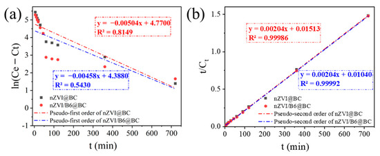According to the kinetic modelling pattern in Figure 8 and the kinetic parameters shown in Table S4, the degradation kinetics of both nZVI@BC and nZVI/B6@BC follow the pseudo-second-order model rather than the pseudo-first-order one, indicating that the chemical reaction between the modified materials and the OTC is the main effect. In addition, there was no significant difference in OTC removal capacities of nZVI@BC and nZVI/B6@BC during 700 min. Meanwhile, the nZVI/B6@BC presented a faster reaction rate with a larger K2 than nZVI@BC, which is attributed to better stabilization and distribution of nZVI on biochar through B6 coating.