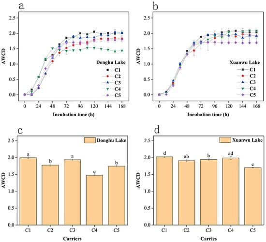 Comparison of metabolic patterns between five carriers with different specific surface areas (C1–C5) in two incubation sites, including Donghu Lake (a) and Xuanwu Lake (b), and five curves with different shapes of dispersion points represent the fitting curves of five carriers, respectively. Comparison of carbon sources utilization of all carbon sources between five carriers with different specific surface areas (C1–C5) in two incubation sites, including Donghu Lake (c) and Xuanwu Lake (d), and different letters, represent a significant difference at p-value < 0.05 by using one-way ANOVA (comparison of biofilm samples from the same station).
