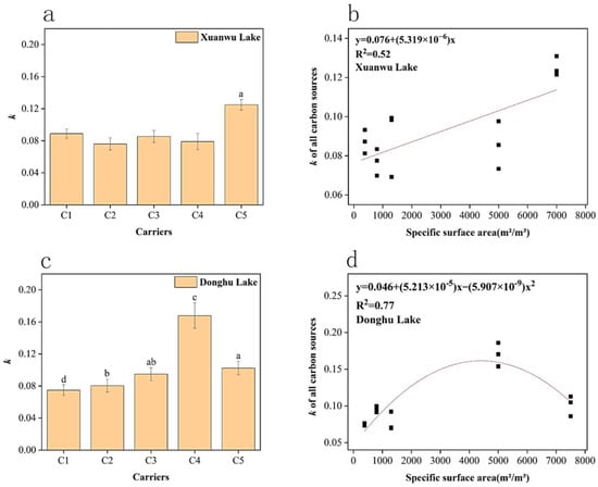 Comparison of carbon metabolism rate between five carriers with different specific surface areas (C1–C5) in Xuanwu Lake (a), and the fitting curve between carbon metabolism rate and carriers’ specific surface area in Xuanwu Lake (b). Comparison of carbon metabolism rate between five carriers with different specific surface areas (C1–C5) in Donghu Lake (c), and the fitting curve between carbon metabolism rate and carriers’ specific surface area in this lake (d). The letters represent a significant difference at p-value < 0.05 by using one-way ANOVA (comparison of biofilm samples from the same station).