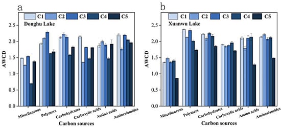 The carbon sources utilization of six carbon source groups between five carriers with different specific surface areas (C1–C5) in two incubation sites, including Donghu Lake (a) and Xuanwu Lake (b).