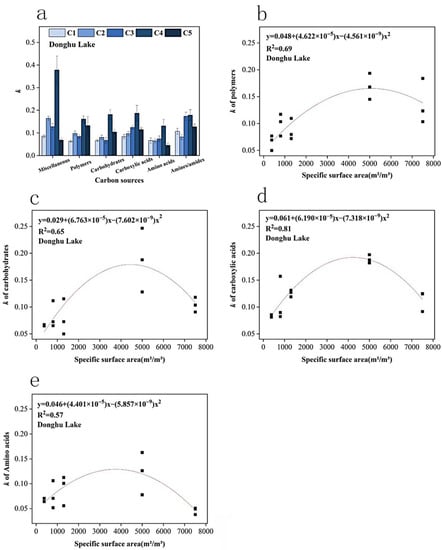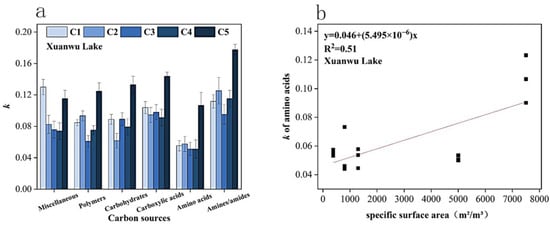 In the Donghu Lake, within a changing specific surface area, the carbon metabolism rate of some classified carbon sources demonstrated a similar law to that of the total carbon source, that is, it presented a parabolic trend of first increasing and then decreasing, especially for polymers, carbohydrates, carboxylic acids and amino acids (Figure 4a–e). For other carbon sources, although the applicability of this trend was not high, they all maintained the common ground that C4 has the maximum carbon metabolism rate. Therefore, we believe that the carbon metabolic activity of six types of carbon sources does not demonstrate a linear correlation with the increase in the specific surface area, but fluctuates with the existence of the threshold. Compared with the Donghu Lake, only the carbon metabolism rate of amino acids in Xuanwu Lake demonstrated a linear trend with the change of specific surface area (Figure 5a,b). For the other types of carbon sources in this lake, the high carbon metabolism rate of C5 was still maintained, but there was no obvious change rule.