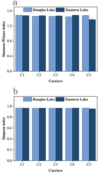 The Shannon-Wiener index (a) and Simpson index (b) of biofilm attached to five carriers with different specific surface areas (C1–C5) in two incubation sites, including Donghu Lake and Xuanwu Lake.
