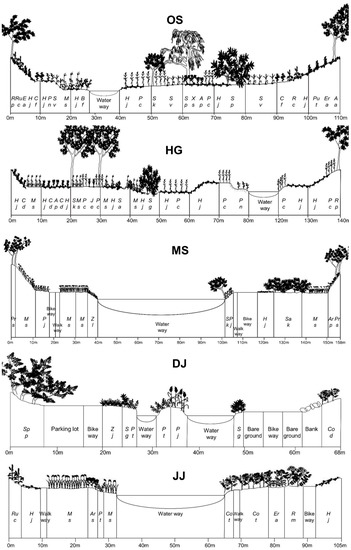 Stand profiles of riparian vegetation collected from the restored rivers. CW: Changwon stream, DJ: Daejeon stream, Gwangju stream, HG: Hwangguji stream, JJ: Jeonju stream, MS: Musim stream, OC: Oncheon stream, OS: Osan stream, SN: Sin stream. Aa: Ailanthus altissima, Arp: Artemisia princeps var. orientalis, Ars: Artemisia selengensis, Bf: Bidens frondosa, Bj: Bromus japonicus, Cag: Campsis grandiflora, Cc: Commelina communis, Cd: Carex dimorpholepis, Cf: Chenopodium ficifolium, Cj: Calystegia japonica, Cod: Coreopsis drumondii, Cot: Coreopsis tinctoria, Ea: Erigeron annuus, Ec: Erigeron canadensis, Fk: Forsythia koreana, Hj: Humulus japonicus, Ht: Helianthus tuberosus, Je: Juncus effusus, Lai: Lagerstroemia indica, Ma: Morus alba, Ms: Miscanthus sacchariflorus, Pc: Phragmites communis, Pj: Phragmites japonica, Pn: Persicaria nodosa, Prs: Prunus serrulata var. spontanea, Pt: Persicaria thunbergii, Put: Pueraria thunbergiana, Rc: Rumex crispus, Rm: Rosa multiflora, Rol: Rorippa indica, Rp: Robinia pseudoacacia, Sa: Sicyos angulatus, Sak: Salix koriyanagi, Sg: Salix gracilistyla, Sk: Salix koreensis, Sp: Salix pseudolasiogyne, Spp: Spiraea prunifolia, Sv: Setaria viridis, To: Typha orientalis, Xs: Xanthium strumarium, Zj: Zoysia japonica, Zl: Zizania latifolia.