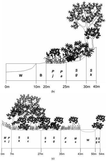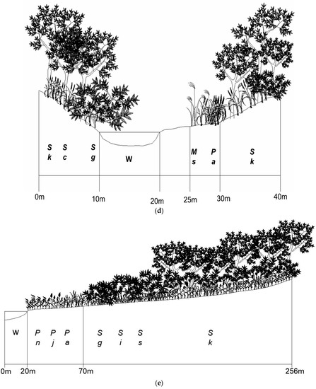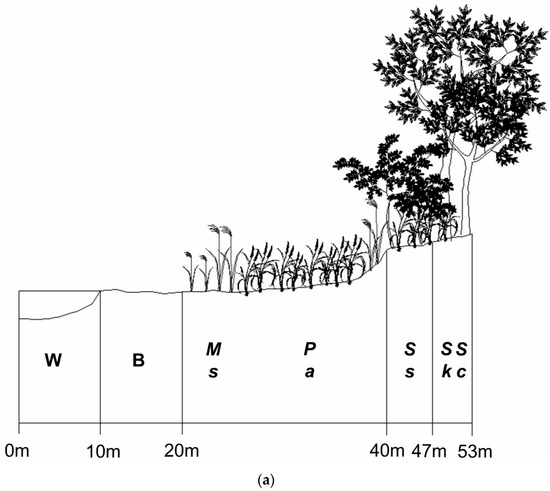 Additionally, the riparian vegetation tended to appear in the order of grassland, shrubland, and tree forest far away from the waterway and thus reflected a flooding disturbance regimen in the natural reference rivers (Figure 3). A P. japonica community and mixed community of P. japonica and Salix gracilistyla dominated the grassland zone. The shrub zone was dominated by S. gracilistyla, Carex dimorpholepis, Acer tataricum subsp. ginnala, etc. and S. koreensis, A. tataricum subsp. ginnala, Juglans mandshurica, Fraxinus rhynchophylla, etc. dominated the tree forest zone (Figure 3).