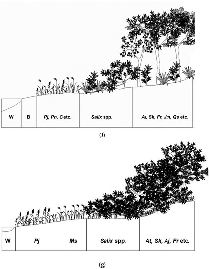 At the end of the floodplain where the power of the rushing water weakens, backwater wetlands are usually formed, Cyperaceae plants grow, and shrubby willows such as S. gracilistyla and S. integra are also often established. Therefore, shrubby willows could be recommended as plants to be introduced into these sites [1,10,70].