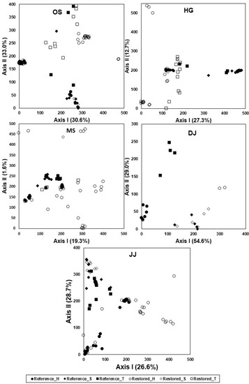 - Hill, M.O.; Gauch, H.G. Detrended Correspondence Analysis: An Improved Ordination Technique. In Classification and Ordination: Symposium on Advances in Vegetation Science, Nijmegen, The Netherlands, May 1979; van der Maarel, E., Ed.; Springer: Dordrecht, The Netherlands, 1980; pp. 47–58. [Google Scholar]