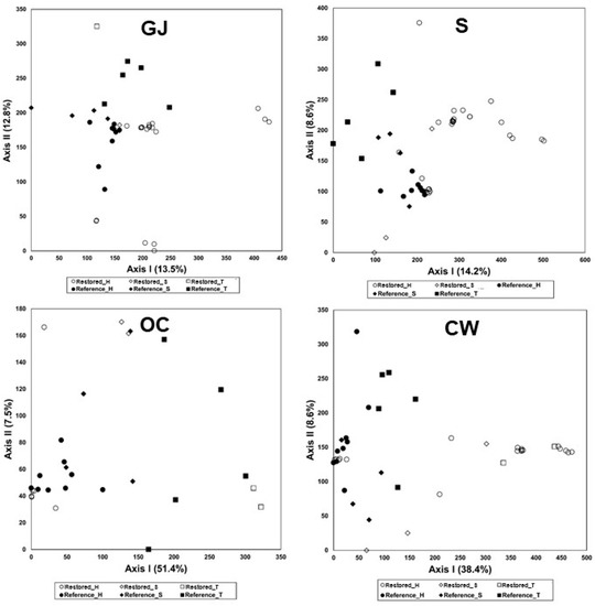 Comparing the species composition of the vegetation between the restored rivers and the reference rivers usually showed a significant difference except for the OC (Figure 4). When comparing the species composition according to the type of vegetation zone, the species composition of the tree dominated vegetation zone that was typically restored with the introduction of S. koreensis and the shrub dominated vegetation zone, that was restored with the introduction of S. gracilistyla, S. integra or S. koriyanagi showed a relatively similar species composition. However, the species composition of the herbaceous plant dominated vegetation zone where various plant species used for landscaping were introduced and where many exotic plants had invaded, showed a significant difference (Figure 4).