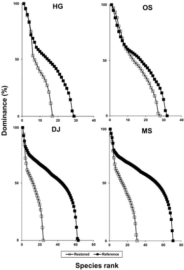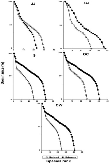 A comparison of the species rank-dominance curves of the vegetation among the restored and natural reference rivers. Abbreviated river name is the same as in Figure 3. Reference: natural reference river, Restored: restored river.