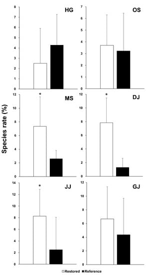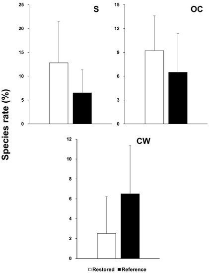 The species richness of the restored rivers was lower than that of the reference river (Figure 5). The species richness showed a large difference among the restored rivers. Comparing the species richness of the restored rivers, the species richness was the highest in the OS and higher in the order of the MS, JJ, CW, S—HG, DJ, OC, and the GJ (Figure 5).