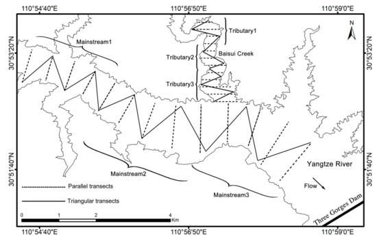 In our comparative study of survey designs in hydroacoustic sampling, we chose the Three Gorges Reservoir (TGR, China), a typical large canyon-shaped reservoir, as the study area, including the mainstream and its adjacent tributary, which is much smaller but generally has higher fish density [13,14]. It is notable that there are more than 98,000 reservoirs in China, a large proportion of which are canyon-shaped due to the geological topography [15]. Canyon-shaped reservoirs are mainly characterized by longitudinal elongation, narrow channels, and deep water [16,17]. Their littoral zones are usually narrow, with steep bottom profiles and complicated substrates, while being significantly influenced by water level fluctuations. Such morphometric features of canyon-shaped reservoirs and their potential effects on fish distribution and the safety of survey vessels should be fully considered in the survey design prior to hydroacoustic sampling. In this regard, we compared the degree of coverage of parallel and triangular transects, and the fish density estimates in two different habitats: within the mainstream and in the tributary of the TGR. We also compared the differences in fish size distribution, as measured by target strength (TS), between the two survey designs.