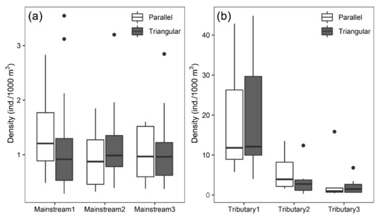 Fish density estimates were similar for the three survey units of the mainstream, while there was a clear trend of increasing fish density with increasing distance from the mainstream in the tributary survey units (Table 2). For the mainstream, the standard deviations of density estimates under the triangular survey design were relatively higher than those under the parallel survey design, which was related to the outlier values under the triangular survey design (Figure 2a). For the tributary, in the survey unit close to the mainstream (i.e., Tributary3), the standard deviation of density estimates for the parallel design was considerably higher than for the triangular design (Figure 2b). The survey unit located at the furthest end of the tributary (i.e., Tributary1) had considerably higher density estimates with a large variation (Table 2, Figure 2b).
