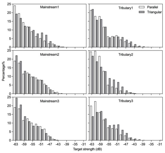 Frequency distribution of fish target strength (TS) estimated acoustically under the two types of survey designs in the mainstream and the tributary. The horizontal axis represents the intervals of TS (2 dB wide), and the vertical axis represents the percentage of individual fish corresponding to each interval of TS.
