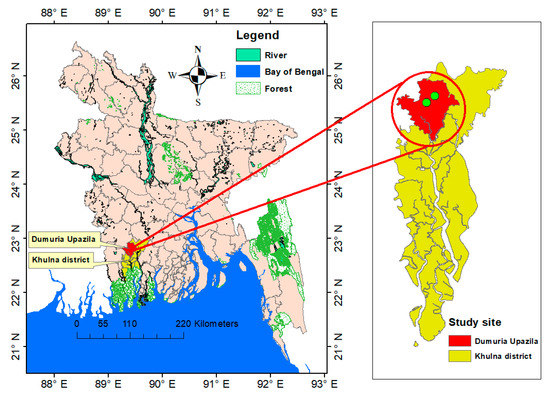 Map of Bangladesh showing the study sites at Dumuria Upazila in Khulna district. Scale applies to the map of Bangladesh only.