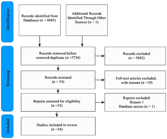 The databases consulted were EEE, Google Scholar, ScienceDirect, SCOPUS, SpringerLink, Taylor & Francis Group and Wiley-Blackwell, resulting in the identification of 30, 572, 1507, 119, 3429, 100 and 328 articles, respectively, with a total of 6085, in addition to 1 article included through snowball searching. Subsequently, duplicates were eliminated, leaving a total of 5736 articles. A first selection of titles and abstracts was then made, eliminating a total of 5682. The remaining 54 articles were exhaustively reviewed, discarding those that did not use techniques to estimate groundwater pumping, reaching a total of 35, of which 1 was discarded due to limited access to databases. This resulted in a total of 34 articles focused on quantifying GWW. Although no temporal restriction was imposed for the search, the first paper found with this criterion was from 1970.