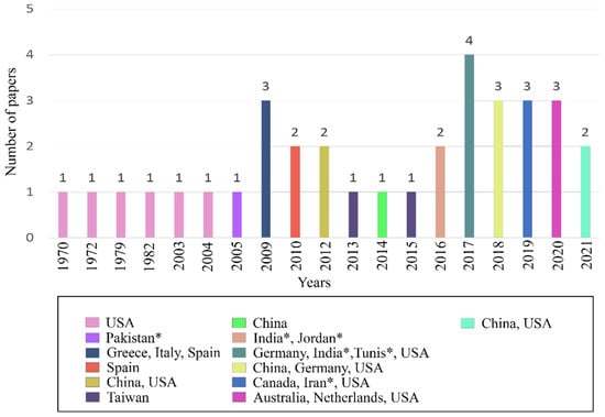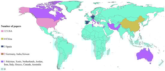 Figure 3 shows the publications made by each country. It can be seen that the United States is in first place with a total of 12 published articles, followed by China with 4 publications and in third place is Spain with a total of 3 publications. Despite not being present in other countries in Figure 3, this does not indicate that they do not have problems of overexploitation; however, most of the research in this area is conducted in the United States and Asian countries with the highest depletion of groundwater worldwide (in terms of volume) [17]. Likewise, the importance of the subject can be observed for the United States, being the country with the highest number of publications and with the first studies carried out in the 1970s, denoting the importance of obtaining an adequate management system for the quantification of groundwater exploitation in their country.