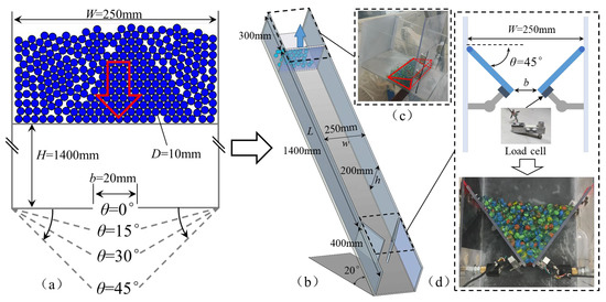 The experiment was carried out in the flume device as indicated in Figure 1b. The flume was made of PVC material with side walls of height h = 200 mm, the width w = 250 mm, and a total length of L = 2100 mm, and erected at an angle of 20° with the ground. As indicated in Figure 1b,c, a door plate was placed 300 mm from the flume top for storing spherical glass particles. The door plate could be bolted by the side wall and pulled out to release the stored glass spherical particles. As shown in Figure 1d, the inclined baffle was installed on the side wall 400 mm away from the bottom of the flume through hinges. According to the reference [8], the maximum impact force in the traditional slit dam occurred at both sides of the slit opening. Therefore, a pressure sensor was set at the end of the baffle along the normal direction of the baffle, with a range of 0~10 N and a measurement accuracy of 0.01 N so that the normal impact force on the baffle could be measured during the movement of particles. According to the simulation results, the included angle between the inclined baffle and the side wall was fixed at θ = 45°, and the slit width b was controlled within the range of 0~40 mm by changing the baffle lengths.