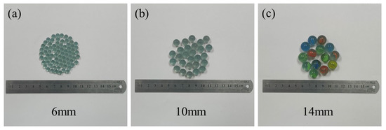 Glass balls have clear characteristic grain diameter and good uniformity. To study the influence of different particle sizes on the impact behavior, as in Figure 2, glass ball particles with diameters d = 6 mm, 10 mm, and 14 mm were used in this experiment. The properties of the glass balls are shown in Table 2.